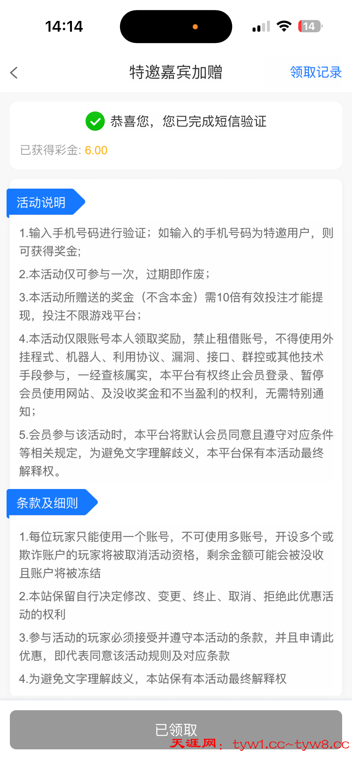 短信特邀6元彩金,黑不黑不知道,因为我没打出来