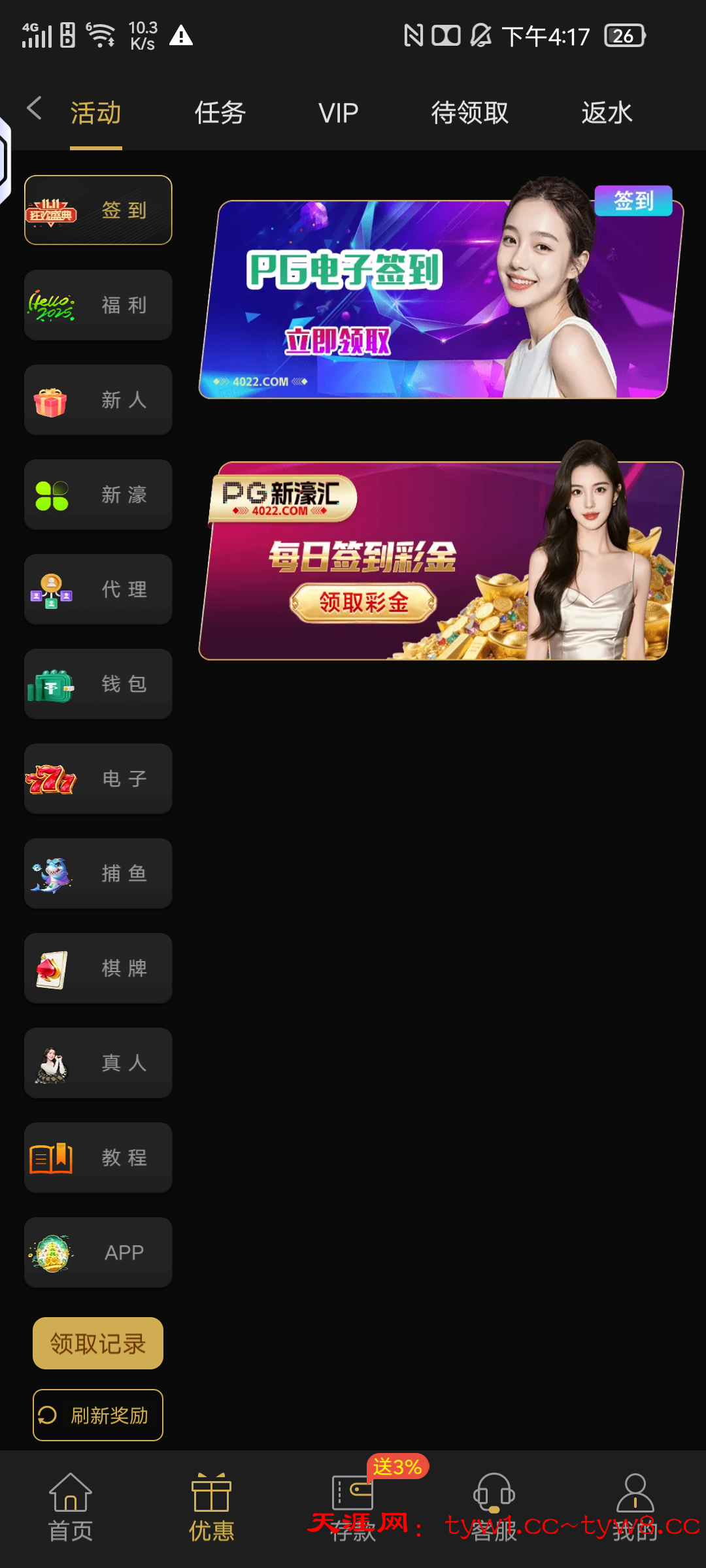 接到电话,说每日签到彩金,看了一下连续签到6天给6.6,12天给18.6,18天给38.6,24天给88.6元,30天领188,签到没有门槛,这个是特邀给的,有号的自行上去看看是不是有特邀门槛,出款自测!