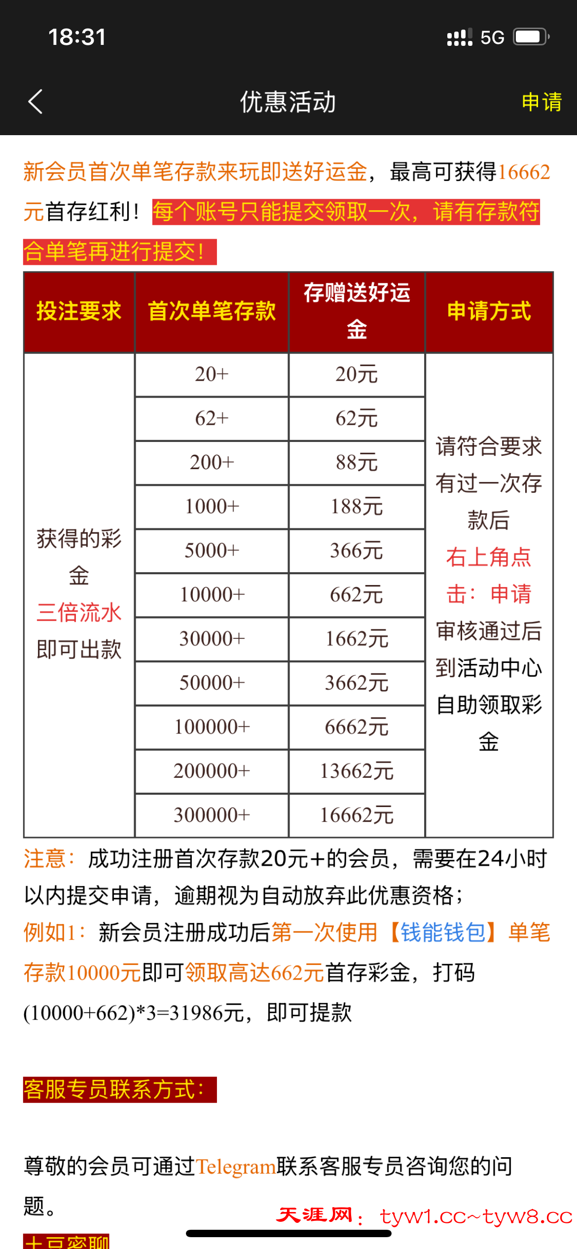 参加了62+62,打到220,流水也够了,他活动没有提款上下限,提现扣了,联系飞机客服也是问什么情况也是直接拉黑,在线客服说我卡免费,他妈的都没有提款上限我卡鸡毛免费扣了盈利.避雷!避雷!避雷