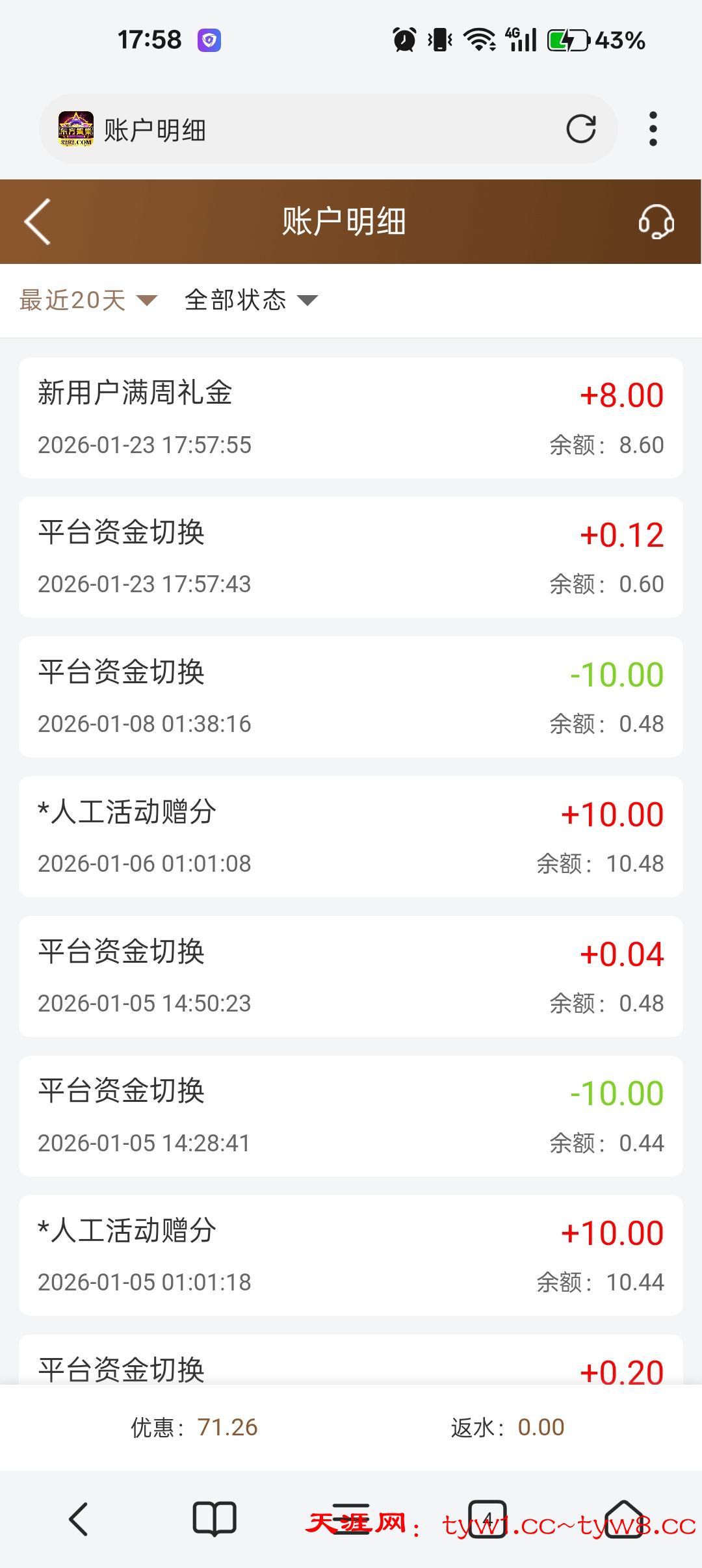 打电话过来第一天38剩下3天10的台子,有过的可以再去领8,新人注册满周彩金,提款自测