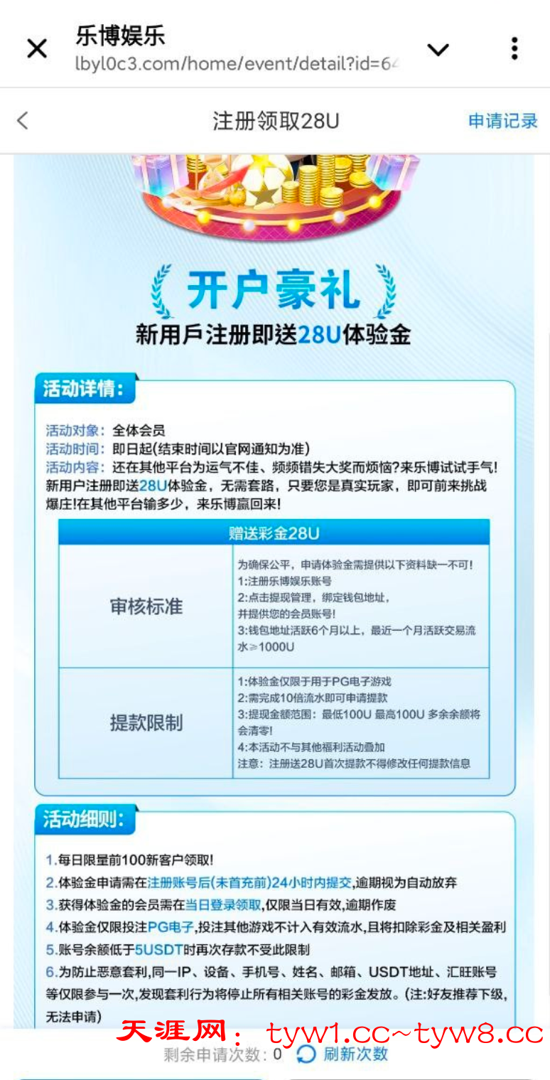 每天一百名额尽量在00点到06点这个阶段申请,乐博娱乐送28u 地址活跃六个月以上本月流水过1000u