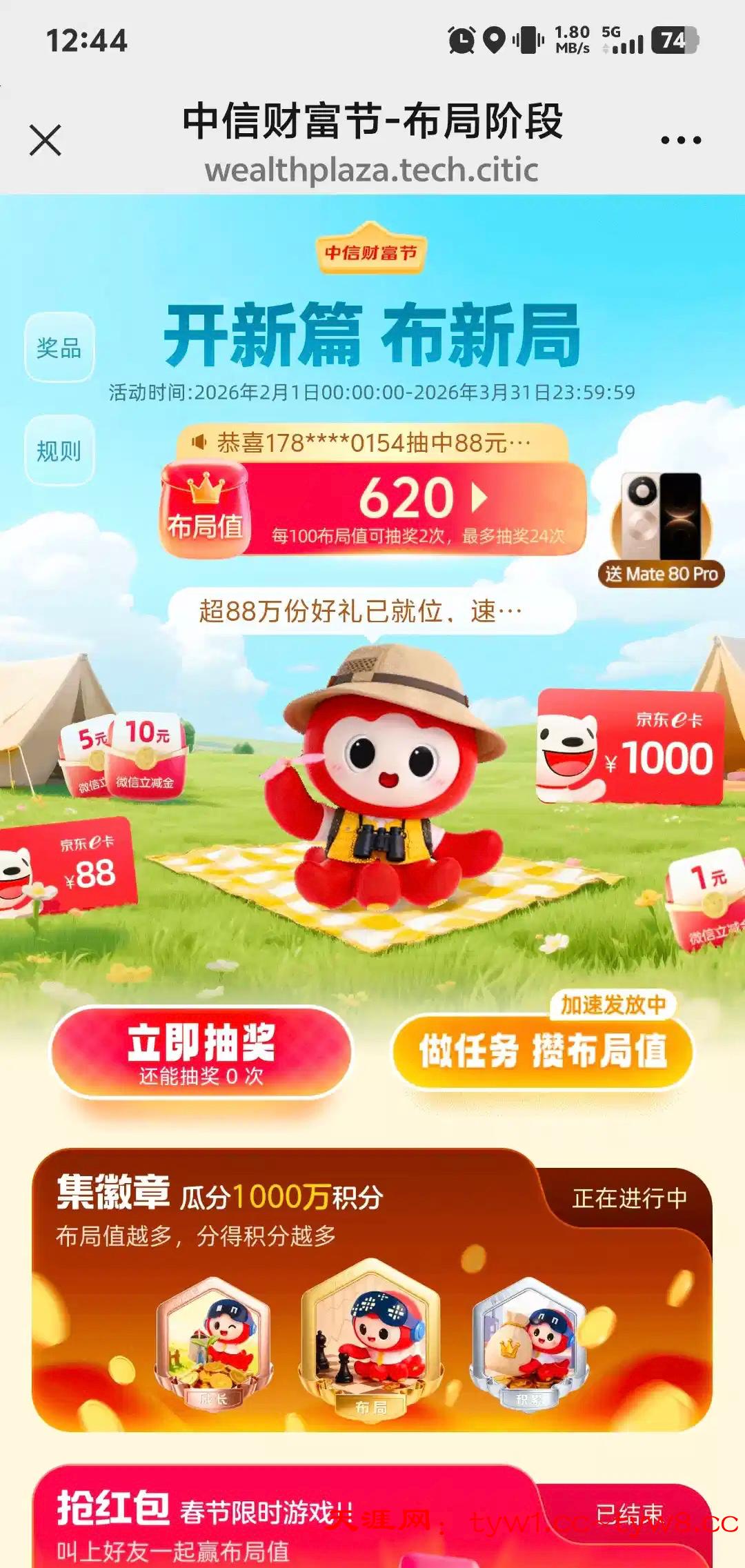 微信搜索中信财富广场 然后点那个兑换立减金的活动,进去浏览点任务,然后抽奖